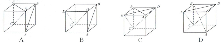 7. 如图,在以下四个正方体中,直线 $ AB $ 与平面 $ CDE $ 垂直的是(