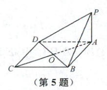 5. C 因为$PA\perp$平面$ABCD$,$BC\subset$平面$ABCD$,所以$PA\perp BC$,又$BC\perp AB$,$PA\cap AB = A$,$PA,AB\subset$平面$PAB$,所以$BC\perp$平面$PAB$,又$PB\subset$平面$PAB$,所以$BC\perp PB$,A正确;因为$PA\perp$平面$ABCD$,$CD\subset$平面$ABCD$,$AD\cap PA = A$,$AD,PA\subset$平面$PAD$,所以$CD\perp$平面$PAD$,又$PD\subset$平面$PAD$,所以$PD\perp CD$,B正确;$PA\perp$平面$ABCD$,$BD\subset$平面$ABCD$,所以$PA\perp BD$,故D正确;连接$PO$,因为$BD\perp AO$,$BD\perp PA$,$AO,PA\subset$平面$PAO$,$AO\cap PA = A$,所以$BD\perp$平面$PAO$,又$PO\subset$平面$PAO$,所以$BD\perp PO$,所以$\triangle PDB$为等腰三角形,且$PD = PB$,所以$BD$与$PD$不垂直,故C错误.