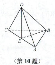 10. 如图所示,在三棱锥$D - ABC$中,若$AB = BC$,$AD = CD$,$E$是$AC$的中点,则平面$ADC$与平面$BDE$的关系是