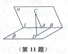 11. 如图,二面角$α - l - β$的棱上有两个点$A$,$B$,线段$BD$与$AC$分别在这个二面角的两个面内,并且都垂直于棱$l$.若$AB = 4$,$AC = 6$,$BD = 8$,$CD = 2\sqrt{17}$,则平面α与平面β的夹角的大小是