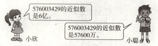 五、他俩说得都对,因为用“亿”作单位写出这个数的近似数,表示把这个数精确到亿位,用“万”作单位写出这个数的近似数,表示把这个数精确到万位。6亿和57600万这两个数都是576003429的近似数,所以他俩说得都对。