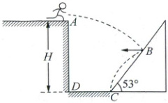 11. [2025四川绵阳月考]跑酷是以日常生活的环境为运动场所的极限运动. 质量$m = 50$kg的跑酷运动员,在水平高台上水平向右跑到高台边缘,以$v_{0}$的速度从上边缘的$A$点水平向右跳出,运动时间$t_{1} = 0.6$s后落在一倾角为$53^{\circ}$的斜面上的$B$点,速度方向与斜面垂直. 此时运动员迅速转身并调整姿势,以$\frac{3}{8}v_{0}$的速度从$B$点水平向左蹬出,刚好落到斜面的底端$C$点.$D$点为平台的下边缘点,假设该运动员可视为质点,不计空气阻力,取$g = 10$m/s²,$\sin53^{\circ} = 0.8$,$\cos53^{\circ} = 0.6$.