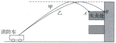 1. B 甲、乙水柱竖直方向上升的高度相同,从最高点到着火点的高度也相同,可知甲、乙水柱竖直方向的运动情况相同,所以甲、乙水柱在空中运动的时间相等,即有$t_1=t_2$,水平方向由于甲水柱的水平位移小于乙水柱的水平位移,则有$v_{甲x}<v_{乙x}$,根据$v = \sqrt{v_x^2 + v_y^2}$,由于甲、乙水柱喷出时竖直分速度相等,所以甲水柱喷出时的速度小于乙水柱喷出时的速度,即有$v_1 < v_2$,故 B 正确。