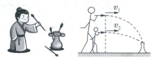 4. 物理生活[2025天津武清月考]宋吕大临在《礼记传》中云:“投壶,射之细也.燕饮有射以乐宾,以习容而讲艺也.”如图所示,某大人和小孩先后直立在界外同一位置,可视为在同一竖直线上不同高度分别水平抛出“箭矢”(可视为质点),都能投入地面上的“壶内”,则 (