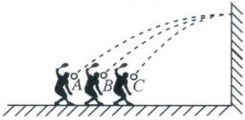3. 壁球是一种对墙击球的室内运动.如图所示,某同学分别在同一直线上相同高度的A、B、C三个位置先后击打壁球,结果都使壁球垂直击中墙壁上的同一位置.设三次击打后球到达墙壁前在空中飞行的时间分别为$t_{1}$、$t_{2}$、$t_{3}$,到达墙壁时的速度分别为$v_{1}$、$v_{2}$、$v_{3}$,不计空气阻力,则 (