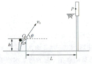 8. [2025山东月考]如图是运动员某次投篮时击中篮板上P点的示意图,O点是篮球的抛出点.已知O、P两点的水平距离$L = 7.2$m,篮球在O点的速度$v_{0} = 10$m/s,方向与水平面的夹角$\theta = 53^{\circ}$,O点离地面的竖直高度$h = 2$m,不计空气阻力,取重力加速度大小$g = 10$m/s$^{2}$,$\sin 53^{\circ} = 0.8$,$\cos 53^{\circ} = 0.6$.下列说法正确的是 (