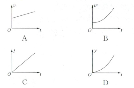7. 新考法[2025陕西安康开学考试]将一石块以水平初速度$v_{0}$抛出,忽略空气阻力,石块做平抛运动过程中,它的速度大小$v$、速度的平方$v^{2}$、位移大小$l$、竖直方向位移大小$y$这四个物理量随运动时间$t$的变化而变化,以下图像可能正确的是 (