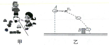 2. [2025 河南模拟]如图甲所示,某人正在进行套圈游戏:将铁丝圈水平抛出,套中物体 $ B $ 就算赢。某次套圈时,铁丝圈的轨迹如图乙所示,落地点在物体 $ B $ 的正前方。为了使铁丝圈水平抛出后能套中物体,可采取的措施是(假设铁丝圈平面始终保持水平,不计空气阻力)(