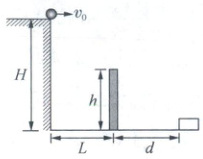8. [2025 湖南月考]如图所示,房顶的高度 $ H = 6.05 \, m $,竖直墙的高度 $ h = 4.25 \, m $,墙到房子的距离 $ L = 2.7 \, m $,墙外公路(封闭路段)的宽度 $ d = 7.2 \, m $,使小球(视为质点)从房顶水平飞出后落在墙外的马路上。取重力加速度大小 $ g = 10 \, m/s^2 $,马路、墙根与房子的底部在同一水平面上,忽略墙的厚度,不计空气阻力。