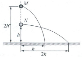 7. [2025 福建福州月考]某排球教练给队员进行击球示范,她先站着将排球以某速度水平击出,然后她又进行起跳击球示范,她起跳后将同一排球以另一速度水平击出,若两次击球点分别为 $ N $ 点、$ M $ 点,击球高度分别为 $ h $、$ 2h $,两击球点在同一竖直线上,且排球落地时的水平位移分别为 $ 2h $、$ h $,如图所示,则(