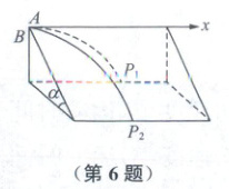 6. 如图所示,$ A $、$ B $ 两质点以相同的水平速度抛出,$ A $ 在竖直平面内运动,落地点为 $ P_1 $,$ B $ 沿光滑斜面运动,落地点为 $ P_2 $。已知斜面的倾角为 $ \alpha $,不计空气阻力,$ P_1 $、$ P_2 $ 在 $ x $ 轴方向上到抛出点的距离分别为 $ x_1 $、$ x_2 $,则(