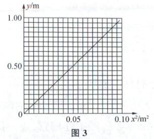 (2)若测出重力加速度$g = 9.80$ m/s²,描点连线画出$y - x^2$图线为过原点的一条直线,如图 3 所示,则说明平抛运动的轨迹为抛物线. 可求出平抛运动的初速度为