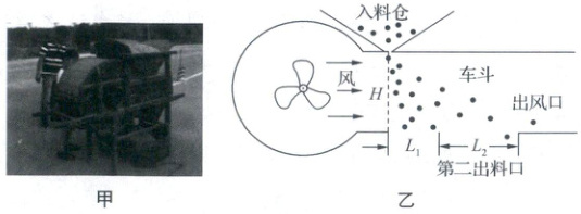 14. [2024 湖南长沙期中]如图甲所示为风谷车(又称风车),我国农业种植中用来去除水稻等农作物子实中杂质、瘪粒、秸秆屑等的木制传统农具,其工作原理可简化为图乙所示:转动摇手柄,联动风箱内的风叶,向车斗内送风,装入入料仓的谷物中混有质量较大的饱粒和质量稍小的瘪粒,均无初速地从入料仓漏下,在车斗中下落高度 H = 0.45 m 后,从宽度为$L_1 = 0.18$ m 的第一出料口出来的都称之为饱粒,其中的最小质量为$1×10^{-4}$ kg;从宽度为$L_2$(待求)的第二出料口出来的都称之为瘪粒,其中的最小质量为$5×10^{-5}$ kg;质量小于$5×10^{-5}$ kg 的草屑被吹出出风口. 只考虑重力和水平风力 F(设每颗粒受到的水平风力都相同,不同颗粒的质量分布是连续的),g 取 10 m/s². 求: