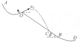 15. [2025 江西鹰潭一模]2025 年 2 月 10 日,鹰潭余江籍运动员杨文龙在哈尔滨亚冬会单板滑雪男子大跳台决赛中勇夺金牌. 如图为简化后的跳台滑雪雪道示意图,AO 段为助滑道和起跳区(倾角为α),OB 段为倾角为β的着陆坡,BD 为停止区. 运动员从助滑道的起点 A 由静止开始下滑,到达起跳点 O 时,借助设备和技巧,以与水平方向成α角(起跳角)的方向起跳,最后落在着陆坡面上的 C 点. 已知运动员在 O 点以$v_0$的速率起跳,轨迹如图虚线所示,不计一切阻力,重力加速度为 g. 求: