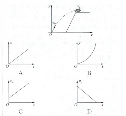 4. (多选)[江西高考真题]一条河流某处存在高度差,小鱼从低处向上跃出水面,冲到高处.如图所示,以小鱼跃出水面处为坐标原点,$ x $ 轴沿水平方向,建立坐标系,小鱼的初速度为 $ v_0 $,末速度 $ v $ 沿 $ x $ 轴正方向.在此过程中,小鱼可视为质点且只受重力作用.关于小鱼的水平位置 $ x $、竖直位置 $ y $、水平方向分速度 $ v_x $ 和竖直方向分速度 $ v_y $ 与时间 $ t $ 的关系,下列图像可能正确的是(
