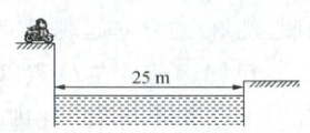 1. [海南高考真题]在跨越河流表演中,一人骑车以 25 m/s 的速度水平冲出平台,恰好跨越宽 $ x = 25 $ m 的河流落在河对岸平台上,不计空气阻力,取 $ g = 10 $ m/s²,则两平台的高度差 $ h $ 为(