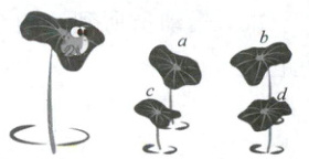 2. [湖北高考真题]如图所示,有五片荷叶伸出荷塘水面,一只青蛙要从高处荷叶跳到低处荷叶上.设低处荷叶 $ a $、$ b $、$ c $、$ d $ 和青蛙在同一竖直平面内,$ a $、$ b $ 高度相同,$ c $、$ d $ 高度相同,$ a $、$ b $ 分别在 $ c $、$ d $ 正上方.将青蛙的跳跃视为平抛运动,若以最小的初速度完成跳跃,则它应跳到(