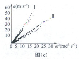 (1)由图(b)可知$a$与$\omega$不是正比关系,图(c)中$a$与$\omega^{2}$成正比,故A错误,B正确。