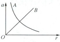 7.AC 因为A为双曲线的一个分支,说明$a$与$r$成反比,由$a = \frac{v^{2}}{r}$可知,A物体运动的线速度大小不变,A正确,B错误;OB为过原点的倾斜直线,说明$a$与$r$成正比,由$a = \omega^{2}r$可知,B物体运动的角速度大小不变,C正确,D错误。
