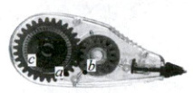 9. [2024山东烟台期末]修正带是中学生常用的学习用具,其结构如图所示,包括上下盖座、大小齿轮、压嘴座等部件,大小齿轮分别嵌合于大小轴孔中,大小齿轮相互吻合,$a$、$b$点分别位于大小齿轮的边缘,$c$点位于大齿轮的半径中点,当齿轮匀速转动时 (