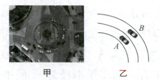 4. (物理生活[2025 广西南宁月考]如图甲所示是隆阳城区九龙环岛的俯视图.$ A $、$ B $ 两车(同种型号可认为质量相等)正在绕环岛做线速度大小相等的匀速圆周运动,如图乙所示.已知 $ A $、$ B $ 两车做匀速圆周运动的半径之比满足 $ r_A : r_B = 2 : 3 $,下列说法正确的是 (