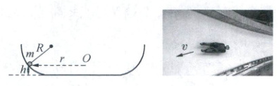 10. [2025 四川月考]运动员趴在雪橇上从山坡沿截面为圆弧形的冰道快速滑降至水平面上的大圆冰道上.雪橇和运动员(可视为质点)的总质量为 $ m $,以速度 $ v $ 在大圆轨道上做匀速圆周运动.冰道横截面为半径为 $ R $ 的圆的一部分,水平大圆冰道轨道圆心为 $ O $,轨道半径为 $ r $,如图所示.雪橇离圆弧形冰道最低点的竖直高度为 $ h = 0.4R $.忽略摩擦和空气阻力,重力加速度为 $ g $.其中 $ R $、$ r $ 未知,求: