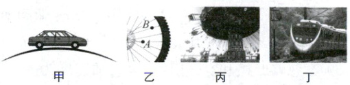 2.D 图甲中汽车通过拱桥最高点时具有向下的加速度,不是处于平衡状态,A错误;图乙中自行车骑行时车轮上A、B两点的角速度相同,根据$v = \omega r$可知线速度大小不相等,B错误;图丙中游客随旋转飞椅做匀速圆周运动时所受合力提供向心力,则合外力不为零,C错误;图丁中火车转弯时外轨高于内轨能减轻轮缘与外轨间的挤压,D正确.
