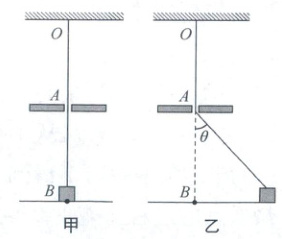 9. [2025 重庆万州期中]悬挂在水平天花板上的轻质弹性绳(满足胡克定律)处于原长时下端正好在$A$点,弹性绳穿过薄板间的光滑小孔悬挂质量$m = 10\ kg$的物块(可视为质点),物块静止在水平平台上的$B$点处,如图甲所示,$A$、$B$两点间的距离$L = 0.64\ m$,此时物块对平台的压力大小$F_{1} = 36\ N$。当平台绕$AB$轴匀速转动,物块相对平台静止时,弹性绳与$AB$轴的夹角$\theta = 37^{\circ}$,如图乙所示。已知物块与平台间的动摩擦因数$\mu = 0.8$,且接触面间的最大静摩擦力等于滑动摩擦力,取重力加速度大小$g = 10\ m/s^{2}$,$\sin 37^{\circ} = 0.6$,$\cos 37^{\circ} = 0.8$,弹性绳处于弹性限度内。