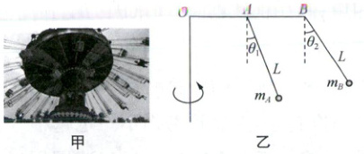 10. [2025 河北邯郸期末]图甲是游乐场中的“旋转飞椅”项目.“旋转飞椅”简化结构装置如图乙,转动轴带动顶部圆盘转动,长为 $ L $ 的轻质悬绳一端系在圆盘上,另一端系着椅子.悬点分别为 $ A $、$ B $ 的两绳与竖直方向夹角分别为 $ \theta_1 = 37° $、$ \theta_2 = 53° $,椅子与游客总质量分别为 $ m_A $、$ m_B $,绳子拉力分别为 $ F_A $、$ F_B $,向心加速度分别为 $ a_A $、$ a_B $.忽略空气阻力,则椅子和游客随圆盘匀速转动的过程中(