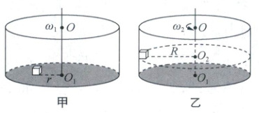 (2)如图乙,当转台的角速度 $ \omega_2 = 10 rad/s $ 时,把小物块放在转台侧壁上,稳定后,小物块随着转台一起匀速圆周运动,此时物块受到的支持力 $ N_2 $ 的大小与摩擦力 $ f_2 $ 的大小;
