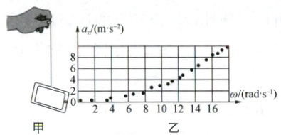 11. [2025 河南郑州模拟]某兴趣小组利用智能手机验证向心加速度与角速度、半径的关系.如图甲所示,用双股细绳将手机竖直悬挂,手机平面与水平面平行,用手搓动细绳带动手机旋转.利用手机内置传感器得到角速度 $ \omega $ 和向心加速度 $ a_n $.图乙为某次实验中利用手机软件绘制的 $ a_n - \omega $ 图像.