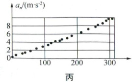 (2)由向心力表达式$F_{n} = m\omega^{2}r$,可得$a_{n} = \omega^{2}r$,则半径一定时,图丙所示的图线为过原点的直线,则横坐标应为$\omega^{2}$.