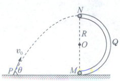 14. [2025 江苏镇江期末]如图所示,半圆形金属管道 $ MQN $ 竖直固定在水平面上,管道半径 $ R = 2.5 m $,直径 $ MON $ 竖直,金属管的内径远小于管道半径 $ R $.将一质量 $ m = 2.5 kg $、直径略小于金属管径的小球从地面上的 $ P $ 点斜向上射出,小球恰好能从管道最高点 $ N $ 处以 $ 6 m/s $ 的速度水平射入,不计空气阻力,$ g $ 取 $ 10 m/s^2 $.求: