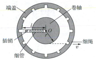 2. [广东高考真题]如图所示,在细绳的拉动下,半径为$r$的卷轴可绕其固定的中心点$O$在水平面内转动.卷轴上沿半径方向固定着长度为$l$的细管,管底在$O$点.细管内有一根原长为$\frac{l}{2}$、劲度系数为$k$的轻质弹簧,弹簧底端固定在管底,顶端连接质量为$m$、可视为质点的插销.当以速度$v$匀速拉动细绳时,插销做匀速圆周运动.若$v$过大,插销会卡进固定的端盖,使卷轴转动停止.忽略摩擦力,弹簧在弹性限度内.要使卷轴转动不停止,$v$的最大值为(