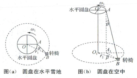 (1)在图(a)中,若圆盘在水平雪地上以角速度$\omega_{1}$匀速转动,转椅运动稳定后在水平雪地上绕$O$点做半径为$r_{1}$的匀速圆周运动.求$AB$与$OB$之间夹角$\alpha$的正切值.