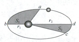 9.CD 根据开普勒第一定律,行星(中心天体)应占据椭圆的一个焦点,A 错误;由开普勒第二定律知,b 点速度最大,d 点速度最小,B 错误;根据开普勒第二定律可知$ v_{b}r_{1}=v_{d}r_{2},$所以卫星在 b、d 两点的速度大小之比为$ \frac{v_{b}}{v_{d}}=\frac{r_{2}}{r_{1}},$C 正确;$S_{1}、$$S_{2} $两个面积大小相等,所以卫星从 b 点到 a 点的运行时间等于从 d 点到 c 点的运行时间,即$ t_{ba}=t_{dc}=t,$那么$ t_{da}=\frac{T}{2}-t,$$t_{bc}=\frac{T}{2}-t,$所以卫星从 d 点到 a 点的运行时间等于从 b 点到 c 点的运行时间,D 正确.