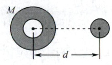 10. 如图所示,一个质量为 $ M $ 的匀质实心球,半径为 $ R $,如果从球上挖去一个直径为 $ R $ 的球,放在相距为 $ d $ 的地方. 那么挖去部分对剩余部分的万有引力为多大?(引力常量为 $ G $)