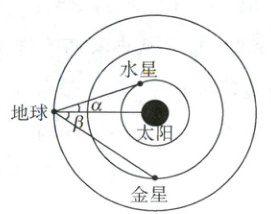 9. (探究题)如图所示,行星绕太阳的公转可以看成匀速圆周运动.在地图上容易测得地球—水星连线与地球—太阳连线的夹角$\alpha$,地球—金星连线与地球—太阳连线的夹角$\beta$,两角最大值分别为$\alpha_{m}$、$\beta_{m}$,则(