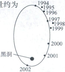 3. [全国乙卷]科学家对银河系中心附近的恒星 S2 进行了多年的持续观测,给出 1994 年到 2002 年间 S2 的位置如图所示。科学家认为 S2 的运动轨迹是半长轴约为 1000 AU(太阳到地球的距离为 1 AU)的椭圆,银河系中心可能存在超大质量黑洞。这项研究工作