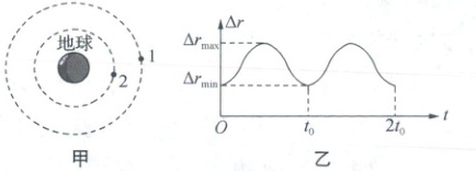 4. [2025 云南模拟]如图甲所示,两颗人造地球卫星 1、2 在同一平面内沿同一方向绕地球做圆周运动,周期分别为 $T_{1}$、$T_{2}$,轨道半径分别为 $r_{1}$、$r_{2}$。某时刻开始计时,两卫星间距 $\Delta r$ 随时间 $t$ 变化的关系如图乙所示,已知 $t_{0}=\frac{1}{7}T_{1}$,则 $\frac{r_{1}}{r_{2}}$ 等于(