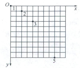 2. (探究题)一观众用频闪照相机照相,拍摄了网球平抛运动中的一段频闪照片.若以拍到的网球位置 1 为坐标原点,以水平向右为 x 轴正方向,以竖直向下为 y 轴正方向,建立坐标系画小方格如图所示,已知每个小方格边长为 9.8 cm,当地的重力加速度大小为 $ g = 9.8 \, m/s^2 $. 相机连续拍摄了 5 张照片,由于技术故障,本应该被拍摄到的网球位置 4 没有显示,则下列判断正确的是 (
