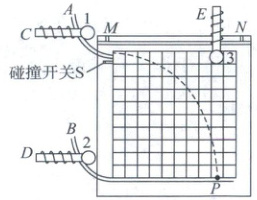 3. (创新题)[2024 浙江金华期末]用如图所示的实验方案来研究平抛运动的特点.在一块竖直放置的背景板上固定两个弧形轨道 A、B,用于释放小铁球,斜槽末端的切线均水平,板上还装有三个电磁铁 C、D、E,其中电磁铁 C、D 可分别沿轨道 A、B 移动.在轨道 A 出口处有一个碰撞开关 S,用以控制电磁铁 E 的电源通断,电磁铁 E 可以沿水平杆 MN 移动,当它吸上小铁球时,该小铁球中心与从轨道 A 射出的小铁球中心在同一水平线上.
