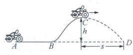 10. 运动员驾驶摩托车做腾跃特技表演是一种刺激性很强的运动项目.如图所示,AB 是水平路面,BC 是一段曲面.运动员驾驶功率始终是 P = 6 kW 的摩托车在 AB 段加速,到 B 点时速度达到最大 vₘ = 30 m/s,再经 t = 15 s 到达坡顶 C 点时关闭发动机后水平飞出.已知人和车的总质量 m = 180 kg,坡顶高度 h = 5 m,落地点 D 与 C 点的水平距离 s = 20 m,g 取 10 m/s².不计空气阻力,如果在 AB 段摩托车所受的阻力恒定,求: