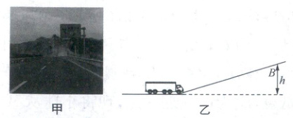 9. [2025 贵州安顺期末]避险车道是指在长下坡路段行车道外侧增设的供刹车失灵的车辆驶离正线安全减速的专用车道,如图甲是某高速公路旁建设的避险车道,简化为图乙所示.若质量为 m 的货车刹车失灵后以速度 v₀ 经 A 点冲上避险车道,运动到 B 点速度减为 0,货车所受摩擦阻力恒定,不计空气阻力.已知 A、B 两点高度差为 h,重力加速度为 g,下列关于该货车从 A 运动到 B 的过程说法正确的是 (