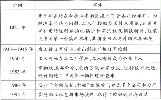 (2)示例一:1881年,开平矿务局建立了胥各庄修车厂。(2分)