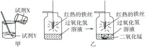 (2)乙是铁丝燃烧的改进实验。①将加热至红热的铁丝伸入盛有过氧化氢溶液的集气瓶中(如左图),铁丝不燃烧。②向集气瓶中加入少量二氧化锰,过氧化氢溶液中产生大量气泡,该反应中二氧化锰起