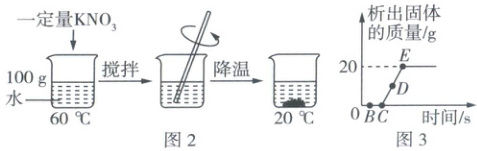 g。(3)如图 2,60℃时,向盛有 100g 水的烧杯中加入一定量的 KNO₃ 固体并搅拌,再降温至 20℃,降温过程中析出固体质量的变化如图 3 所示。