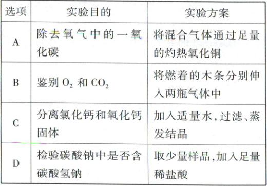 D.除去 CO₂中混有的少量 O₂——将气体通过灼热的铜网