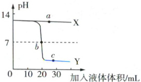 8. 新考法 数字化实验 向各盛 $20mL$ 等浓度氢氧化钠溶液的两个烧杯中,分别滴加水和稀盐酸,利用 $pH$ 传感器测得烧杯中溶液 $pH$ 与加入液体体积的变化关系如图。下列说法错误的是(