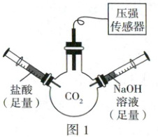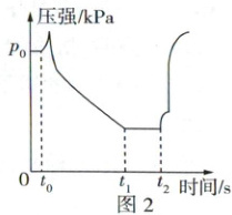 10. (原创新题)在三颈烧瓶中用排空气法收集 $CO_{2}$ 气体,然后将三颈烧瓶与盛有盐酸、$NaOH$ 溶液的注射器和压强传感器密封连接(如图 1,装置气密性良好)。$t_{0}$ 时快速注入第一种溶液,$t_{2}$ 时快速注入第二种溶液,测得瓶内压强随时间变化的曲线如图 2 所示。下列说法正确的是(